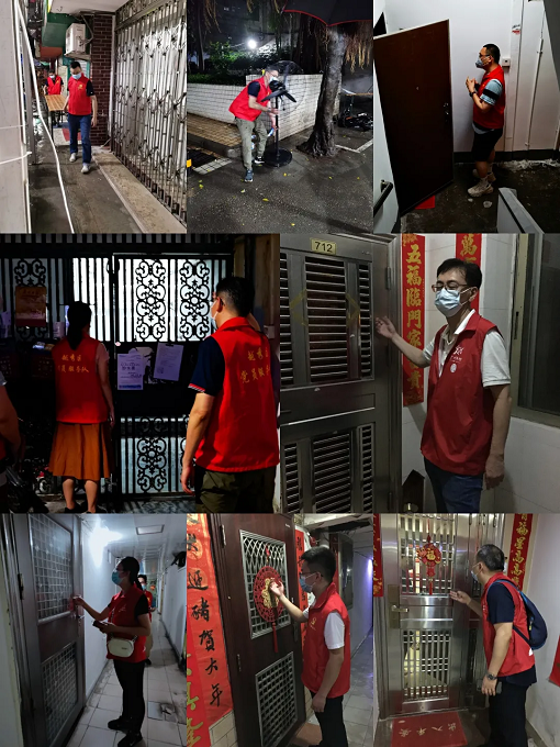 傍晚时分,越秀区下起了大雨,晚上7:00前,10名队员冒雨提前到达了集合地越秀区洪桥街社区,按照社区工作人员的安排,10名队员分成两个5人小组,分别负责上门通知洪庆坊社区小石新街、马庄巷社区的居民到核酸检测点进行核酸检测、运送核酸检测点所需物资、维持现场秩序、协助受检居民登记相关信息等工作。